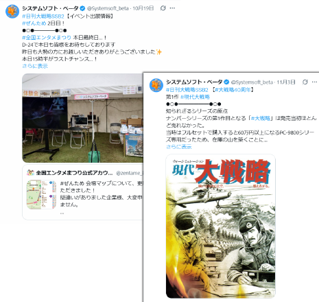 10.18~10.20 【イベント出展情報】 10.22~10.23 【お取扱い店舗情報】 10.25~10.27 【お取扱い店舗情報】 10.28 【掲載情報】 10.29~11.01 【お取扱い店舗情報】 11.02 【予告】 11.03~11.21 【大戦略40周年】 今後も関連情報を随時お送りします。