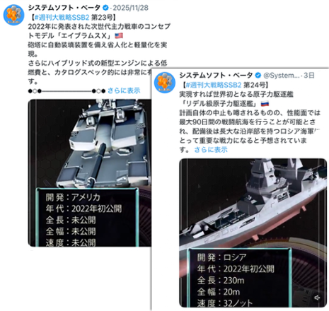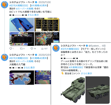 11.22~12.01 【大戦略40周年】 【特典情報】 【システム紹介】 【新規ビジュアル公開】 12.01~12.26 【クイズ】 【開発秘話】 【システム紹介】 【モデラー推しポイント】 【マップ紹介】 【新要素紹介】 今後も関連情報を随時お送りします。
