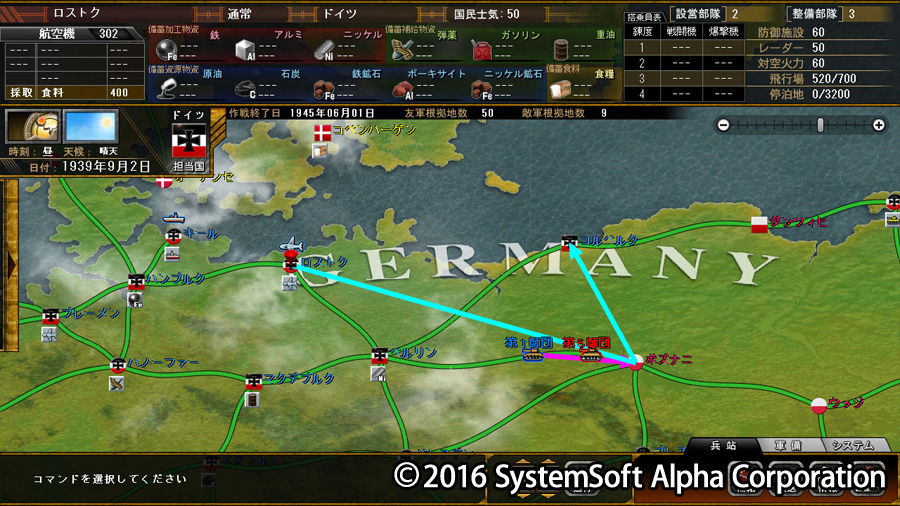 これらの部隊は特定の根拠地で編制することができます。戦況を見極め、必要な部隊を編制して敵の根拠地への攻撃、敵の迎撃を行いましょう。