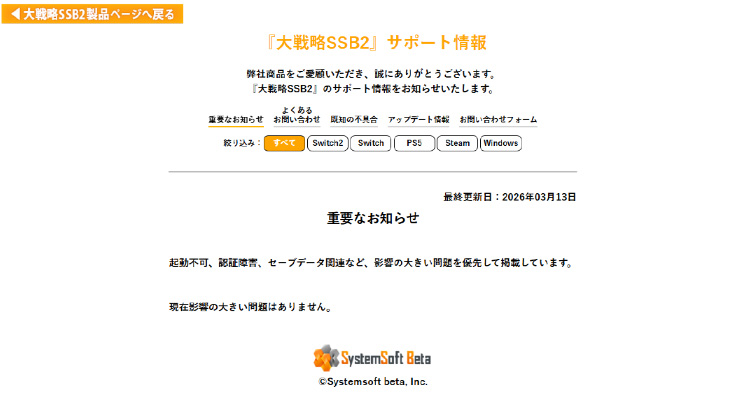 本作のアップデートや不具合などの情報をまとめたページを、公式サイト内にご用意しました。