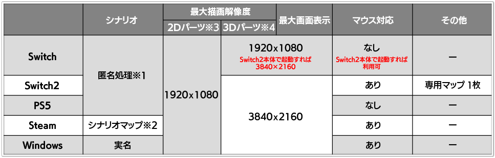 - 全プラットフォームともに、2Dパーツの最大描画解像度は1920x1080です。2Dパーツ例:UI、マップ選択画面、兵器詳細画面。