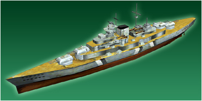 ドイツ海軍最大最後の戦艦。英国との海軍条約の制限内の設計で行われた筈だが、完成した戦艦は制限の排水量35000tを遥かに越えた41700tで、これは建造当時世界最大の戦艦だった。非常にバランスの良い火力を持った高性能戦艦であったが、大戦中は通商破壊任務に従事し、目立った戦果は残していない。1番艦ビスマルクは英海軍の雷撃を受けて撃沈、2番艦ティルピッツはランカスター爆撃機の12000ポンド爆弾を3発受けて大破、横転し着底している。