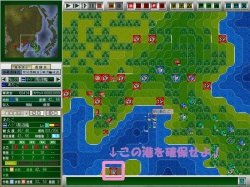 またある程度、赤陣営の建物を占領したら、画像内に□で囲んである港を占領しましょう。前線での補給地点として非常に重宝します。