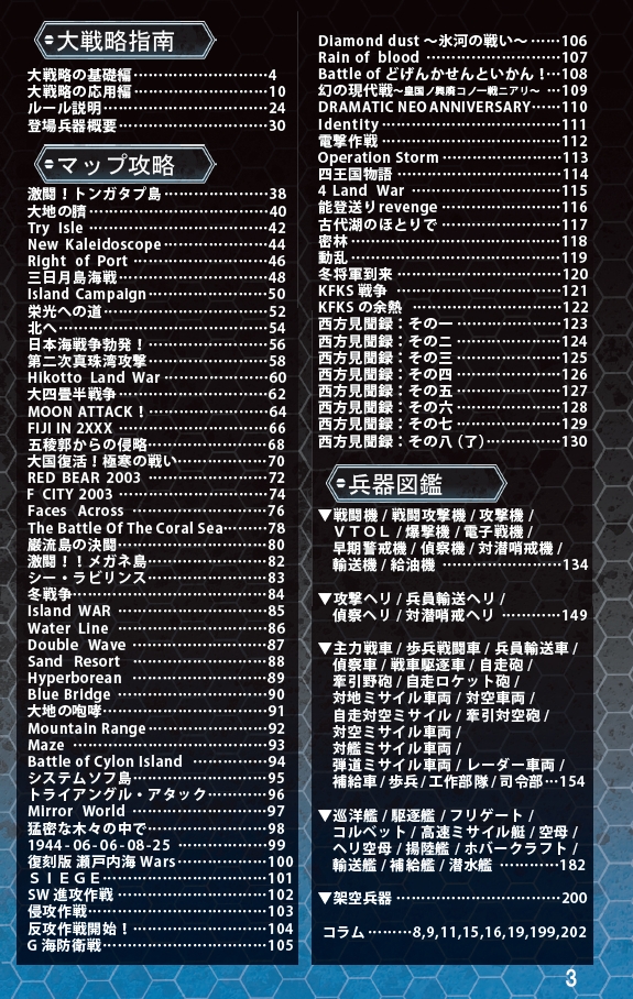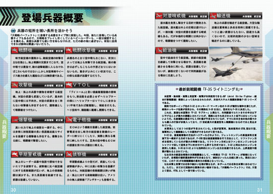 カテゴリー別の兵器の特徴などを解説し、さらに兵器毎の性能(ゲーム中でのパラメータ)を兵器図と共に紹介しています。