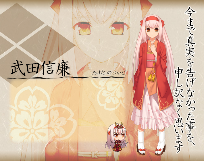 甲斐、武田家の当主の影武者として、信玄を陰に日向に人知れず支えている人物。幼少時から影として生きる事を託された彼女の信玄として振る舞いは完璧で、その存在に気づいている者はいない。本当の彼女は、ひたむきで暖かく、優しい女の子だが、そんな彼女の存在を知るのは信玄と、先代当主から秘密を託されたひとにぎりの人物のみである。