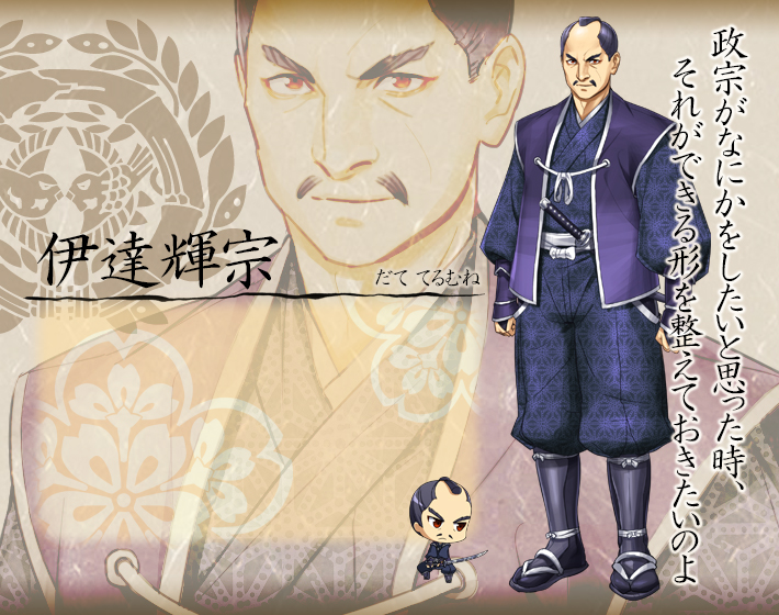 陸奥国、伊達家の当主。温厚篤実な人物で、家臣の信頼も篤い人物。一人娘の政宗に大きな期待を寄せ、次代の伊達家を睨んで政宗の周りにこれはと見込んだ人物を配し、見守ってきている。政宗に傾ける愛情は並々ならぬものがあり、多少親馬鹿の傾向が見られる。