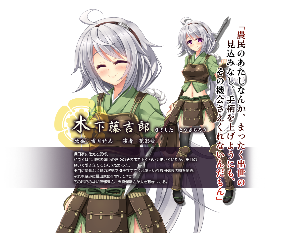 後の豊臣秀吉。戦国時代から安土桃山時代にかけての武将・戦国大名。 尾張国愛知郡中村の百姓として生まれ、天文23年頃から織田信長に小者として仕える。 清洲城の普請奉行、台所奉行などを率先して引き受けて大きな成功をあげた。 そうして信長の感心を買うことに成功し、次第に織田家中で頭角をあらわしていった。 この頃、その風貌によって信長に「猿」「禿げ鼠」と呼ばれていたらしい。 信長が本能寺の変で明智光秀に討たれると、中国大返しにより、京へと戻り、山崎の戦いで光秀を破り、信長の後続の地位を得る。 その後、大阪城を築き関白・太政大臣に任ぜられた。豊臣姓を賜り、日本全国の大名を従え天下統一を成し遂げた。