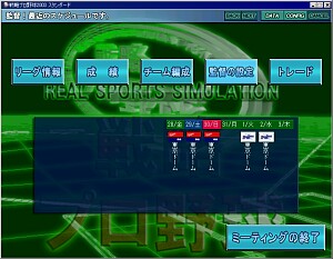 ミーティング画面では、リーグ情報や成績の確認、チームのオーダー変更やトレードも行なえます。