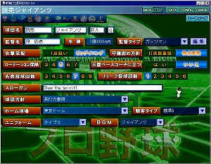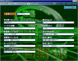 試合中、 "監督モード" で"まかせる"指示を出した場合や、 "観戦モード" では、コンピュータが采配を揮って試合が自動的に進行します。このときに、コンピュータの采配方針を決定するのが監督の設定です。