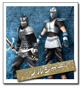 戦争を生業とする、いわゆる傭兵のスペシャリスト。 戦いの場を求めて、人の多く集まる場所にいることが多い。 魔力は全く備わっていないため、魔法を使うことは出来ないが、体力・力強さ・敏捷性に優れており、常に戦闘の第一線を安心して任せられる。